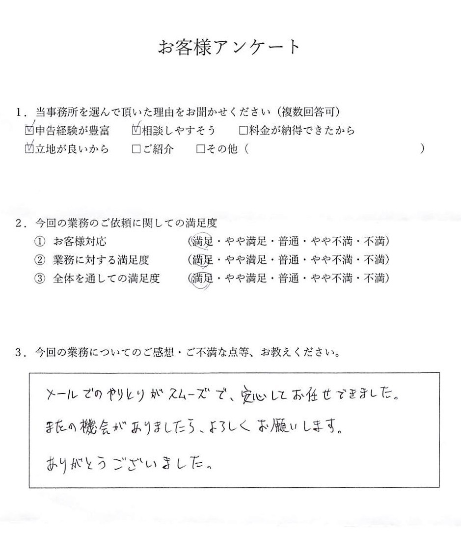 お仕事がお忙しい中、資料収集など非常に素早くご対応頂きありがとうございました。ご不明な点などを適宜お問い合わせくださり、円滑にコミュニケーションを取らせていただけたことで、スムーズに申告まで進めることが出来ました。